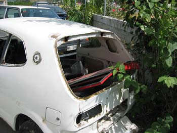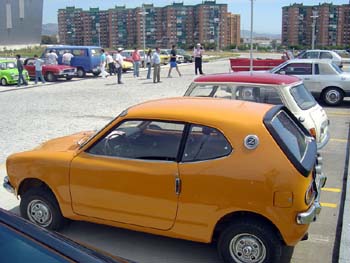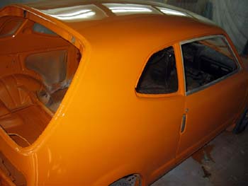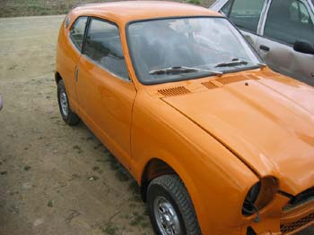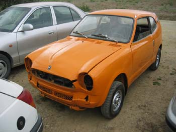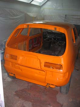Y llegó el día en que lo ví pintado por primera vez. El código de pintura es el “POP Orange” (YR-12) de Honda, que es con el que salió el coche de fabrica, y que tardaron un mes en mandarlo desde Barcelona porque no lo encontraban. Lo curioso es que en las microfichas que tenía el chapista, estaban los códigos de pintura del Honda N 600 (el forero Óscar tiene uno, por si queréis ver de qué modelo se trata), que es el modelo anterior y que no se comercializó en España. El “televisor” (ventanal trasero) era una de las piezas nuevas originales que llevaba el coche, el anterior dueño lo debió comprar hace relativamente poco, pues las gomas estaban impecables y el color grisáceo es el de la imprimación que trae de fábrica, siendo su color el negro (y así se pintó). Esta es una pieza realmente “jodida”, ya que es de las pocas que Honda ya no hace y no hay en stock (de hecho el otro honda que tengo lleva un plástico remachado en lugar de cristal), así que hice bastante hincapié al chapista en que esa pieza debía seguir intacta.