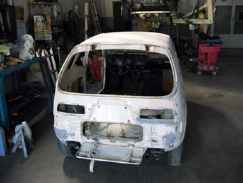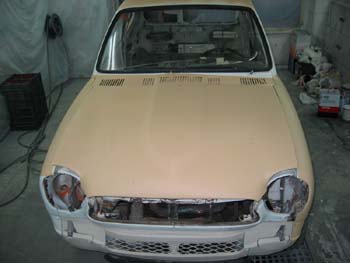 Antes de pintar se imprimó el coche, y aunque tal vez no sea la mejor manera (hubiese sido mejor quitar la pintura) es otra manera de proceder si no dispones de presupuesto suficiente. Aunque se no le habían quitado la luneta delantera después si lo hicieron y fue un detalle que la verdad no me hizo mucha gracia, pues podrían haber quitado la luneta delantera y directamente imprimar todo (menos mal que me iba a costar igual). De todos modos creo recordar que lo imprimaron directamente pues había partes en chapa viva y es ahí cuando la corrosión ataca con más virulencia. Recuerdo que cuando fui una vez a chorrear unas piezas del mini me dijo el operario que imprimase sin falta pues las piezas se oxidarían rápido (y para colmo el día de recogida llovía); así que para todo aquel que esté pensando en hacer una restauración en condiciones, recomendarle que se lleve una lona el día de recogida del coche del “chorreador” y que vaya directamente a la cabina de pintura a imprimar.