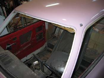 Aquí ya sin la luna delantera y con el tapizado del techo suelto. Al final con mucho cuidado se soltaron los scais de los pasos de rueda traseros para hacer las cosas un poco mejor. En las esquinas de la luna (se ve en negro) se lijó, echó oxino y se soldó un poco de chapa galvanizada nueva.