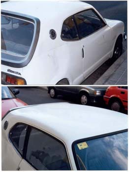 El coche tenía un golpe considerable en el lado derecho, pero en estos coches y en este tipo de chapa es cabrearte un poco, dar un puñetazo y sacar medio bollo para afuera.