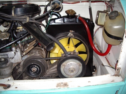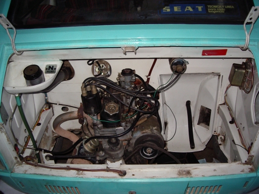 Se colocó el termostato y sus juntas, manguitos, radiador y finalmente la bomba del agua con los álabes. También aproveché para cambiar las corres de la dinamo y de la bomba de agua (esta operación fue la que más guerra me dio, realmente 'no estoy acostumbrado' a los motores todo-atrás SEAT y poco a poco voy descubriendo sus peculiaridades).