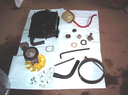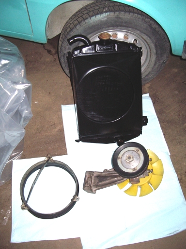 El siguiente paso será limpiar concienzudamente el radiador, quitar un poco de roña a la bomba (sobre todo los álabes del ventilador) y volver a montar todo el circuito de refrigeración poniendo termostato y manguitos nuevos.