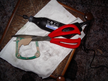 Ahora es sencillo recortarla con unas tijeras. Previamente habremos hecho los agujeros de los espárragos utilizando un minitaladro, una broca y una muela cónica:
