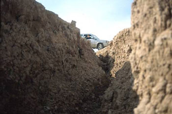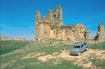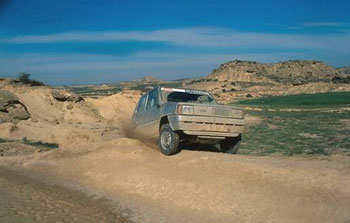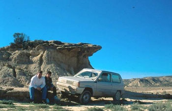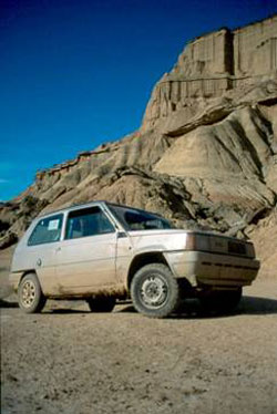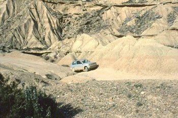 Nos adentramos en Las Bardenas por la zona norte por una bonita pista en la que vamos dejando a la derecha varios desniveles como Cornialto y la Punta de la Estroza. En este terreno debemos andar con mucho cuidado porque en algunos sitios la erosión ha hecho desaparecer el camino y se forman socavones capaces de tragarse de un bocado nuestro pequeño Panda.