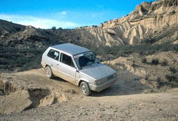Le colocamos unas viejas ruedas Firestone de tacos provenientes de la antigua Copa Marbella de Rallys de Tierra y un cubre-carter que mi amigo adaptó proveniente creo que de un Ford Fiesta.