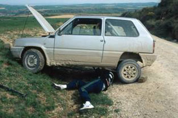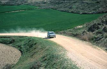 Como ha llegado la hora de comer nos vamos a Castejón por carretera y después de una buena comida nos dirigimos a Villafranca. Desde aquí cambia totalmente nuestra mentalidad y pasamos a buscar la pista de tierra que va paralela a la autopista en dirección norte con la intención de soltar la mecánica del Panda llegando a adelantar a coches que iban en paralelo por la autopista a velocidades cercanas a los 110 Km/h que sobre tierra a veces acojona un poco.