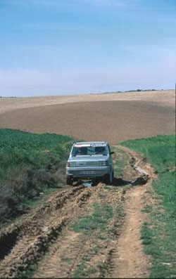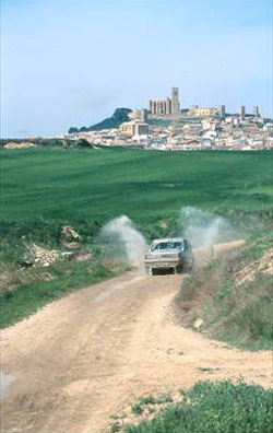 La salida de Miranda de Arga la hacemos por la carretera asfaltada que va a Tafalla, pero a unos siete kilómetros cogemos un camino que sale a la izquierda. En esta zona fue donde más problemas tuvimos para seguir la ruta, ya que el camino se acababa y teníamos que seguir campo a través por zonas de hierba bastante húmedas hasta que a lo lejos divisamos Artajona y nos decidimos a parar a comer ya que hacía más de tres horas que no metíamos nada al cuerpo.