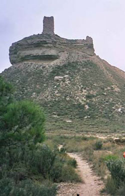 Salimos dirección norte y al poco cogemos la carretera de Ejea de los Caballeros. Unos 7 Km después cogemos la pista de tierra que sale a la derecha hacia Monte Olivete por zonas muy inhóspitas y pedregosas en las que sólo vemos algún corral de ovejas abandonado
