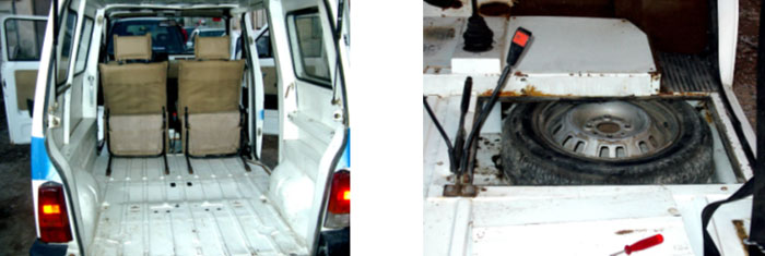 Se crea una plataforma a nivel de la línea del suelo del maletero, quedando un suelo totalmente plano. Obviamente, entre el suelo original del Panda, que conserva las guías de los asientos originales y la nueva superficie queda un hueco, que es aprovechado para colocar una trampilla y dar acceso a la rueda de recambio, situada bajo el asiento del copiloto.