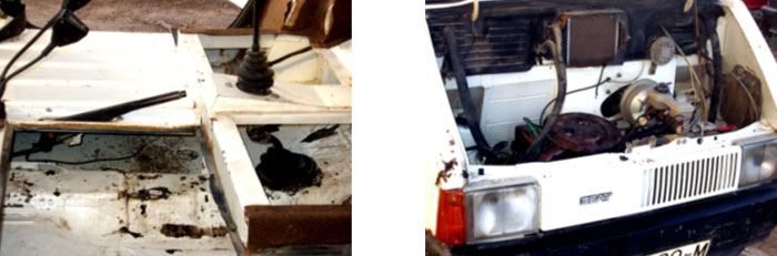 En la parte delantera, en la zona que actúa de cortafuegos entre motor y habitáculo se coloca un suplemento sobre la zona del pedalier original, en el que se recoloca la zona que comprende marco de parabrisas y un tercio de techo del Panda donante. Toda la zona de los cortafuegos es modificada, creando un hueco motor más corto y alto. En este nuevo cortafuegos se recoloca la carcasa de la calefacción y la bomba de freno con "master". La rueda de repuesto lógicamente desaparece, ya se hizo mención de la nueva colocación, y el soporte de la batería es pasado al paso de rueda derecho.