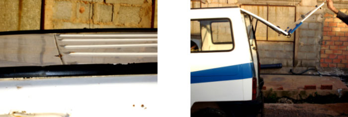 El techo es también de chapa embutida con nervios longitudinales. La parte trasera del mismo, la zona donde se alojan las bisagras del portón trasero, es también un "pedazo" reciclado del donante. El capot delantero y el trasero de bisagra son de fibra.