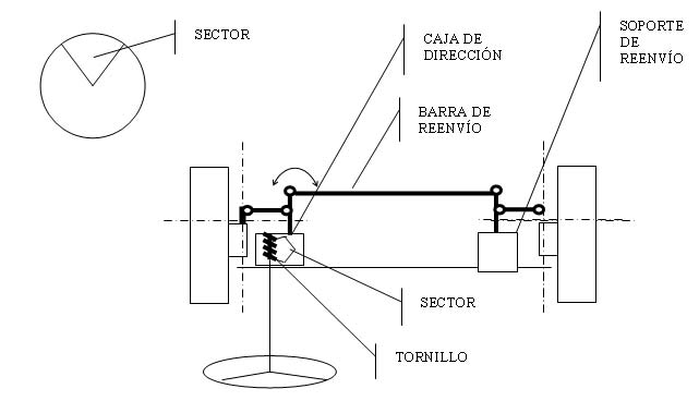 La caña del volante se inserta en el estriado del eje del tornillo sinfin (1), al girar éste, el sector gira un diente por vuelta del tornillo. En el eje del sector (7) se inserta el brazo de dirección (6), de modo que ambos giran solidarios. El brazo tiene dos orificios: en el más interno se inserta la rótula que se unirá por el otro lado a la mangueta de la rueda izquierda, en el más externo se inserta la rótula de la barra de reenvío, que actúa sobre un brazo similar sujeto en el lado derecho del coche, en el llamado soporte de reenvío. Este sistema hace que el mismo movimiento de la rueda izquierda se transmita a la rueda derecha, por medio de una rótula que se inserta en el orificio más interno del brazo del reenvío. (Ver esquema general)