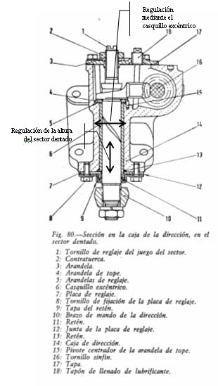 El sector dentado debe contactar en el centro del tornillo sinfín. Para ello se pueden introducir más o menos arandelas de regulación (fig 80-5) y después se actúa sobre el tornillo de reglaje del juego del sector (Fig 80 – 1) para que no presente holgura, pero sin apretar demasiado, lo que produciría agarrotamiento. La posición se fija mediante la contratuerca (Fig 80 -2).