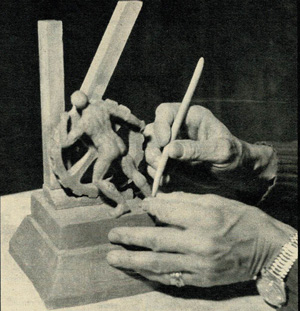 Para poder contar con un trofeo digno de quienes lo van a recibir, lo hemos encargado a uno de los escultores más famosos de España: a Santiago de Santiago. Famoso por su obra escultórica, y famoso y popular al mismo tiempo por haberse asomado muchas veces ya a las pantallas de televisión. Santiago de Santiago ha esculpido una obra muy expresiva. La obra, el trofeo, —según pueden apreciarlo en la portada de este número—, está formado por un grupo en el que aparece, al fondo, la letra V, inicial de nuestra publicación, pero símbolo también de victoria. En realidad, la idea es que represente la victoria, pero con la V en el mismo tipo de imprenta que empleamos como cabecera de nuestra publicación.