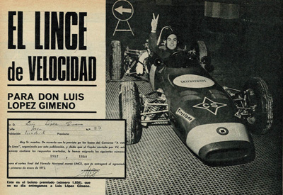 Hecho un verdadero flan, con una alegría juvenil contagiosa, nos dice que se ha enterado el mismo lunes —tres días después del sorteo— al ser llamado a casa; que había imaginado que era una broma de su familia y que no se lo acababa de creer. Nervios y emoción en el afortunado, que brevemente nos dice también que es un asiduo del circuito del Jarama, que es un entusiasta de los fórmula nacional y, por supuesto, del Lince, al que ha visto ganar ya varias carreras este año. Tiene carnet de conducir, pero no vehículo, ya que hasta ahora alquila uno de vez en cuando para salir con los amigos a dar un paseo. No sabe si correrá, aunque cree que no por no disponer de medios económicos para ello, si bien considera que el tener ya el vehículo facilita enormemente el problema.