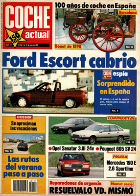 Fotos espía del nuevo Ford Escort. Prueba del Mercedes 190E 2.6 Sportline. 100 años de automóvil en España. Un cargo, un coche. Prueba Comparativa: Opel Senator 3.0i 24v/Peugeot 605 SV 24. Nuevo Nissan 300 ZX. Franco Sbarro, coches a la carta. Correr en monoplazas. Conducir fumando. Auto-cross test. Mónaco, algo más que un gran premio.