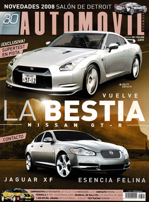 Prueba del Nissan GT-R. Prueba Comparativa: Aston Martin DB9 Volante/Mercedes SL600. Primer contacto con el Jaguar XF, por Arturo de Andrés. Prueba Racing: Ferrari 430 GT2 LM Michelotto.