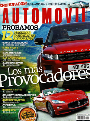 Contactos: Range Rover Evoque, Opel Ampera, Fisker Karma, Volkswagen Beetle, Maserati Grancabrio Sport, Hyundai Veloster. Prueba del Ariel Atom 3. Prueba del Can-Am Spyder RS-S SM5. Prueba del quad Can-Am Commander 1000 EFI XT. Prueba del Caterham Seven. Prueba del Ferrari 275 GTB. Prueba del KTM X-Bow Street. Prueba del Smart Electric Drive. Técnica: Corvette Engine Build Experience. Dossier: Españoles en el Campeonato Mundial de Rallyes. Magazine: Al volante de AUTOMOVIL.