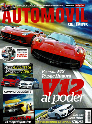 Prueba Comparativa: Ferrari F12 Berlinetta/Pagani Huayra. Prueba Comparativa: Audi A3 Sportback 1.8 TFSi/Mercedes A250 Sport. Contacto: Mercedes E63 AMG S 4Matic, Seat León SC, por Arturo de Andrés. Juan Manuel Fangio y TAG Heuer. Prueba Comparativa: Seat Ibiza Cupra 2.0 16v/Seat Ibiza Cupra R/Seat Ibiza Cupra TDi/Seat Ibiza Cupra 1.4 TSi.