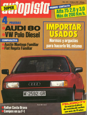 Banco de Pruebas del Audi 80 1.8 E. Primer contacto con las nuevas versiones del Alfa Romeo 75 (2.0 Twin Spark y V6 3.0). Presentación del Citroën AX. Entrevista con Vittorio Ghidella , administrador delegado de Fiat Auto S.p.A. Banco de Pruebas del Volkswagen Polo Diesel CL. Prueba comparativa: Austin Mongeo Estate 2.0 EFi/Fiat Regata Weekend 100 S ie. Retromobile de París. Rallye Costa Brava.