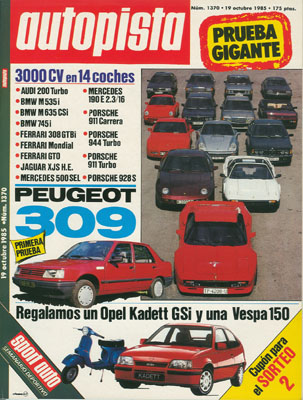 Banco de Pruebas del Peugeot 309 GR. Microcoches y vehículos 4x4 en París. Concentración Jaguar en Brighton. Gran prueba comparativa: Ferrari GTO/Ferrari 308 GTBi/Ferrari Mondial/Porsche 928 S/Porsche 911 Turbo/Porsche 944 Turbo/Porsche 911 Carrera/BMW M 535i/BMW M 635CSi/BMW 745i/Mercedes 190 2.3-16/Mercedes 500 SEL/Jaguar XJS H.E./Audi 200 Turbo. Rallye San Froilán. Euroturismos Estoril.