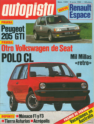 Banco de Pruebas del Volkswagen Polo CL. Mil Millas de Brescia, con la participación del Pegaso Spider Touring Tibidabo. Clásicos deportivos en el Montseny. Arturo Andrés prueba el Peugeot 205 GTi 1.6. Presentación del Renault Espace. Rallye Acrópolis. Gran Premio de Mónaco. Rallyes de Tierra: RACE-León.