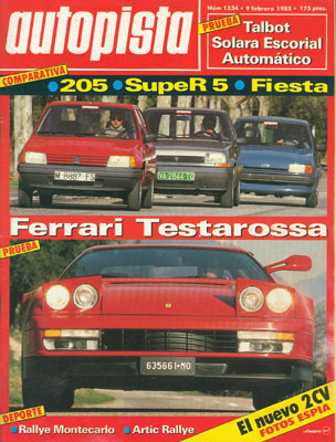 Prueba Comparativa: Renault 5 TL/Ford Fiesta 1.0/Peugeot 205 GL. Prueba del Ferrari Testarossa. Banco de Pruebas del Talbot Solara Escorial Automático. Ferrari Testa Rossa 1957-1962. Artic Rallye. Rallye de Montecarlo.