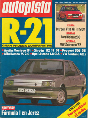 Prueba del Renault 21 TXE y su comparativa con: Alfa 75 2.0, MG Montego, Citroen BX GT, Opel Ascona 1.8i GLS, Peugeot 505 GTI y VW Santana GX5, prueba del Citroen Visa GTI 115cv, futuro VW Corrado, GP de F1 de España y muchos reportajes mas.