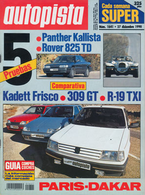 Banco de Pruebas del Rover 825 SD. Banco de Pruebas del Panther Kallista 2.9i. Maserati renueva su gama. Prueba Comparativa: Opel Kadett Frisco 1.8i 3p/Peugeot 309 GT/Renault 19 TXI 5p. Fórmula Renault. París-Dakar, 13 años de aventura.