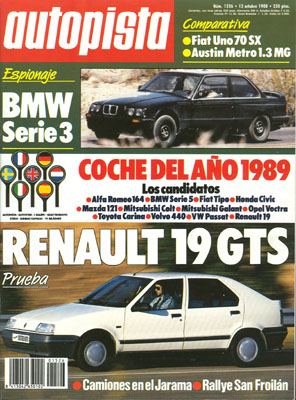 Banco de Pruebas del Renault 19 GTS. Salón del Automóvil de Amman. Prueba Comparativa: Austin Metro 1.3 MG/Fiat Uno 70 SX. Fermín Vélex prueba su monoplaza Lola T-88/50 F-3000. Rallye de San Froilán. Camiones en el Jarama.