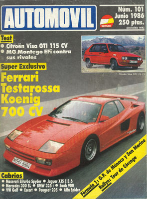 Prueba del Ferrari Testarossa Koenig 700 CV. Comparativa: MG Montego Efi y sus rivales. Arturo de Andrés prueba el Citroën Visa GTi 115 CV. Prueba del Mercedes 300 SL. Comparativa: Escarabajo 1500/Golf GLi. Fórmula 1: Mónaco y San Marino. Tour de Córcega. Mille Miglia.
