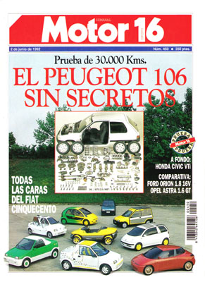 Peugeot 106 XT a los 30.000 km. Prueba del Honda Civic VTi. Prueba Comparativa: Ford Orion Ghia 1.8i 16v/Opel Astra GT 1.6i 4p. Diez trajes para el Cinquecento. Salón de Portugal. Entrevista con Jordi Gené. Benetton Ford B-192. Mil Millas.