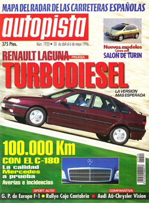 Prueba del Renault Laguna 2.2 dT RXE. Salón de Turín. 100.000 km con el Mercedes C180. Zeus, un español de alta tensión. Prueba Comparativa: Audi A6 2.8 30v/Chrysler Vision Autostick. Mujeres al volante. Camel Trophy Kalimantan '96. Campeonato de España de Rallyes de Tierra. Rallye Caja Cantabria. Gran Premio de Europa de F1.