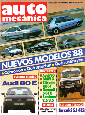 Nuevos Santana 2500 y 3500. Estudio técnico del Suzuki SJ 413. Técnica: los motores V8 Ferrari-Lancia Thema. Consultorio técnico. La evolución del neumático. Estudio técnico del Audi 80 E. El túnel de viento. Indice de temas publicadas en 1987.