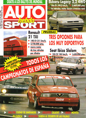 Prueba del Seat Ibiza Slalom Contact. Prueba del Subaru Legacy 2.2. Prueba del Renault 21 TXI. Circuitos: Calafat. XII Rallye Ciudad de Santander. Raid Montes de Cuenca. Fórmula 1: test de Imola.