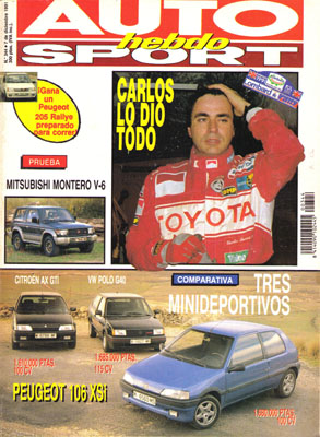 Prueba Comparativa: Peugeot 106 XSi/Citroën AX GTi/Volkswagen Polo G40. Prueba del Mitsubishi Montero V6. Clásicos: Peugeot 403. Mundial de Rallyes: Kankkunen, tricampeón. Todas las pruebas regionales. Carrera de Campeones.