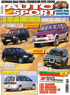 Al volante del Kia Sportage. Prueba Comparativa: Ssangyong Musso 602 EL/Jeep Cherokee 2.5 TD. Nuevo Opel Frontera gama '95. 4 Horas de Jerez de Resistencia. Avance del Rallye de Portugal. Todas las competiciones regionales.