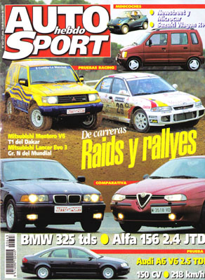 Prueba del Audi A6 2.5 TDi. Prueba Comparativa: Alfa Romeo 156 2.4 JTD/BMW 325 tds. Conducir sin carnet. Prueba del Suzuki Wagon R+. Superturismos en el Circuito del Jarama. Todas las competiciones regionales. Balance de Peugeot en competición en 1997. Off Road: Equipo Toyota en el Dakar '98. Prueba racing del Mitsubishi Montero 2.5 V6 T1 Sonauto. Prueba racing del Mitsubishi Lancer EVO III Gr.N de Luis Climent.