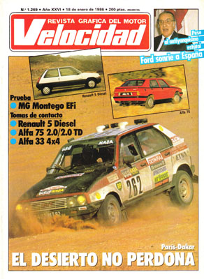 Toma de contacto con el Alfa Romeo 75 2.0/2.0 Turbodiesel. Henry Ford II: "Almusafes, de los mejor de Europa". Prueba del MG Montego EFi. Toma de contacto con el Renault 5 Diesel. Historia de la Fórmula 1, los pilotos: Ayrton Senna. Consultorio técnico del lector. Las Ford Transit '86. Hispano-Suiza 16 T de 1915. Rallye Montecarlo. Vélez y Villota al Sport Prototipos. Los planes de Vilariño y Egozkue. París-Dakar.
