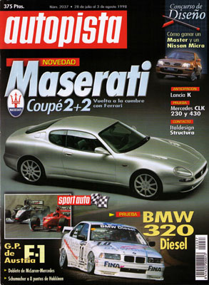 Concurso de diseño de Autopista. Motorpress International adquiere la totalidad de Luike-motorpress, S.A. Nuevo Renault Twingo 2. Nuevo Maserati Coupé 2+2. Futuro Lancia Kappa. Prueba del Cadillac Seville STS. Consultorio del lector. Prueba del Mercedes CLK 230 Kompressor. Contacto con el Italdesign Structura. Prueba racing del BMW 320d de circuitos. Gran Premio de Austria de F1. Problemas en el Rallye Rías Bajas. Turismos en Jerez.