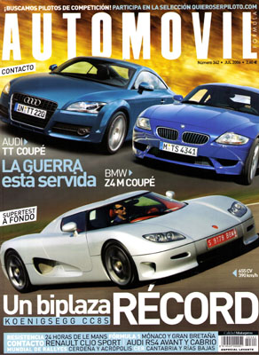 Supertest: Koenigsegg CC8S. Contactos: BMW Z4 M, Audi TT Coupé, Renault Clio RS, Audi RS4 Cabrio y Avant. Fórmula 1: Mónaco y Gran Bretaña. Rallyes de Cerdeña y Acrópolis. Rallyes de Canarias y Rías Bajas. 24 Horas de Le Mans. Campeonato de España de GT: Jarama.
