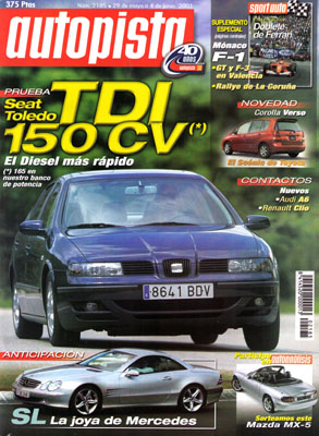 Anticipación: Mercedes SL. Nuevo Toyota Corolla Verso. Contacto: Nuevo Renault Clio. Prueba del Seat Toledo 1.9 TDI 150 CV Sport. G.P. de Mónaco de F1. Rallye de La Coruña. Campeonato de España de G.T.: Valencia. Clásicos: Mille Miglia 2001. Compra de coches por Internet. Prueba del Chrysler Sebring Cabrio 2.7 V6 Limited. Contacto: Audi A6, Hyundai Elantra 2.0 CRDi, Kia Shuma II.