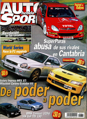 Prueba Comparativa: Mitsubishi Carisma Evolution VII/Subaru Impreza WRX STI. Prueba del Ford Fiesta 1.4 Ghia. Al volante del Ssangyong Rexton. Prueba Comparativa: BMW Compact 320 TD/VW Golf TDI 150. Rallye de Cantabria. Todas las pruebas nacionales.
