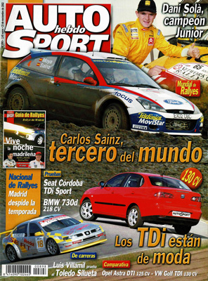 Entrevista con el nuevo presidente del RACE, Juan Luis Huidobro. Prueba del Seat Córdoba TDi 130 CV Sport. Prueba Comparativa: Opel Astra DTi 125CV/VW Golf TDi 130 CV. Prueba del BMW 730d. Nuevo Toyota Avensis. Rallye de Gran Bretaña. Todas las pruebas regionales. Entrevista con Juan Ollé. Clásicos: IV Tour de España. Prueba del Seat Toledo Silueta, por Luis Villamil.