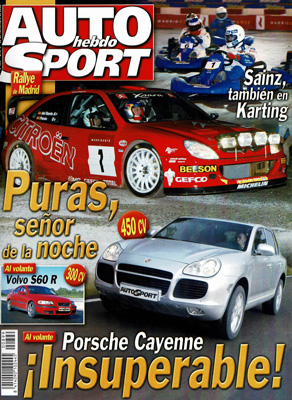 Al volante del Porsche Cayenne. Prueba Comparativa: Audi A4 1.8T Quattro/Audi A4 2.5 V6 TDI 163. Al volante del Volvo S60 R. Al volante del Citroën Berlingo. Prueba del Hyundai Getz 1.6 GLS. Jaime Alguersuari, del karting a la F1. Rallye de Madrid. Todas las pruebas regionales. Reportaje: cirugía plástica para coches. Raid Telefónica Dakar 2003. Clásicos y andaluces: avance Jerez.