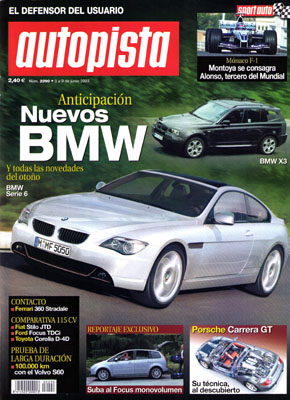 Contactos: Ferrari Challenge Stradale, Hyundai XG 350. Presentación del Ford C-Max. Anticipación: BMW Serie 6 y X3. Prueba Comparativa: Fiat Stilo 1.9 JTD/Ford Focus 1.8 TDCi/Toyota Corolla D4-D. Nuevo Subaruy Legacy y Mitsubishi Grandis. Prueba de larga duración: Volvo S60 2.4 T. Técnica: Electrónica al servicio de la seguridad, Porsche Carrera GT, Lamborghini Gallardo. Reportaje: Uro Rebeco, el todo terreno del ejército. Motortec 2003. 500 Millas de Indianápolis. Entrevista a Dani Solá. G.P. de Mónaco de F1. Rallye Rías Baixas.