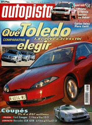 Prueba Comparativa: Seat Toledo 1.8 20V/Toledo 2.3i V5/Toledo 1.9 TDi. Prueba del Ford Cougar 2.5 V6. Contacto: Mercedes AMG CLK-GTR. Nuevos Nissan Xterra, Pathfinder e Hipermini. Actualidad: las fusiones automovilísticas. Estadística: el mercado español en 1998. Seat en el Mundial 99. Granada-Dakar 99. Entrevista a Carlos Sainz y Piero Liatti.