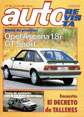 Prueba del Opel Ascona 1.8i GT 5p. Encuesta: el decreto sobre talleres. Rover CCV, un nuevo concepto de Austin-Rover. GANVAM replica una información de AUTO REVISTA. La conducta del conductor. El grado térmico de las bujías. Scania pisa fuerte en Brasil. Cambio de aceite y filtro. VW Polo Copa, un interesante debut en Puerto Banús. Campeonato de España de Producción. Estadísticas: producción, venta y exportación de la automoción nacional en abril de 1986.
