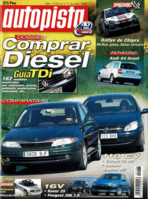 Prueba Comparativa: Citroën C5 2.0 HDI SX/Renault Laguna 1.9 dCi Expression. Contacto con el Suzuki Liana 1.6. Dossier Diesel. Nuevo Subaru Legacy. Multimedia sobre ruedas. Prueba Comparativa: Peugeot 206 1.6 XT 5p/Rover 25 1.6 Classic 5p. Prueba Comparativa: Renault Clio 1.5 dCi/Seat Ibiza 1.9 SDi. 500 Millas de Indianápolis. Rallye de Chipre.