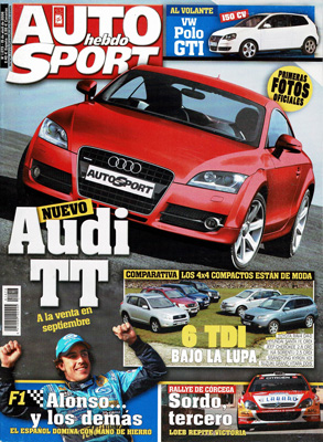 Prueba Comparativa: Hyundai Santa Fe 2.2 CRDI/Kia Sorento 2.5 CRDI/Jeep Cherokee 2.8 CRD/Suzuki Grand Vitara DDiS/SsangYong Kyron Xdi/Toyota RAV4 D-4D. Al volante: Audi TT, Volkswagen Polo GTi, nueva gama AMG de Mercedes: CLK 63, ML 63, SL 65 y S65. Rallye de Córcega. Fernando Alonso y sus rivales. Subida a Ubrique.